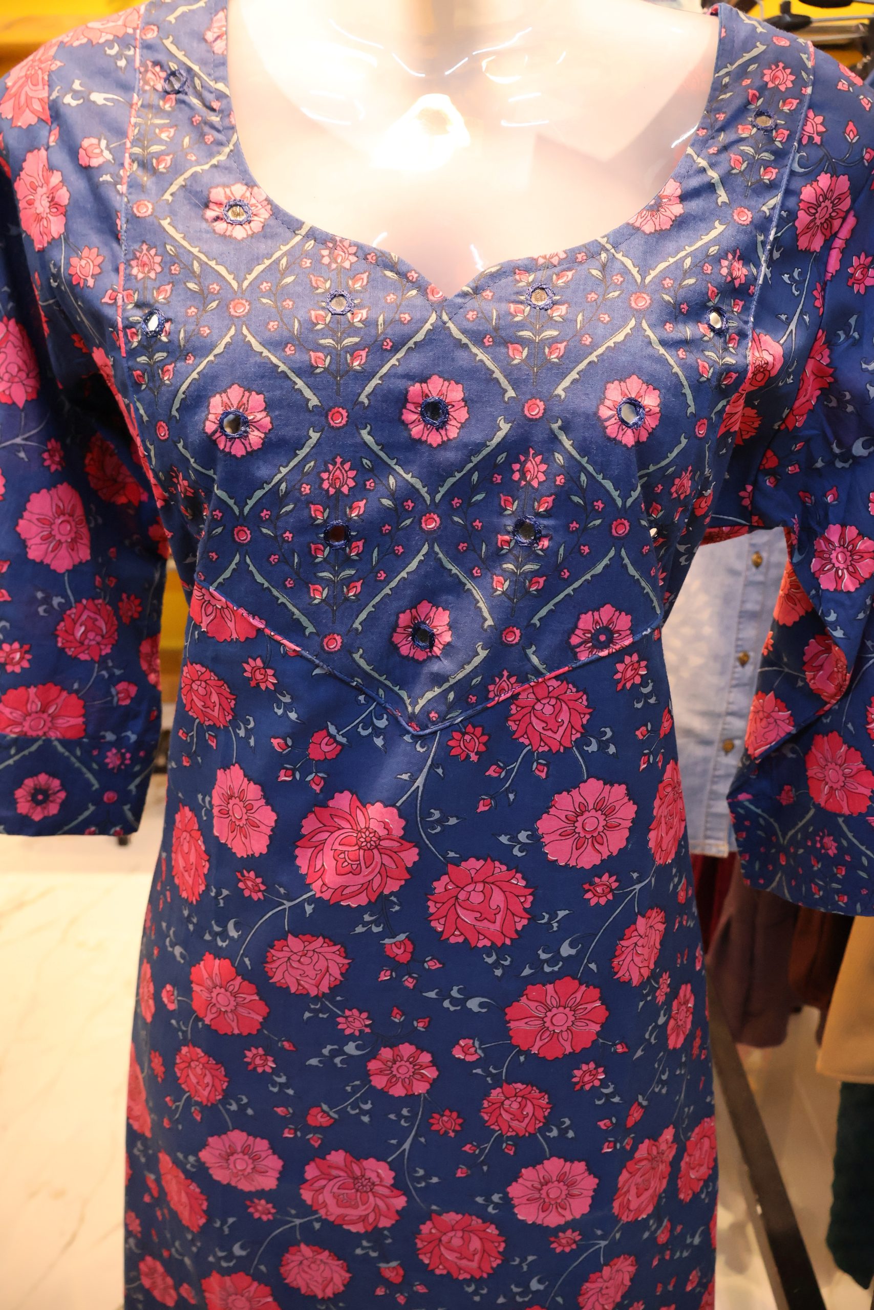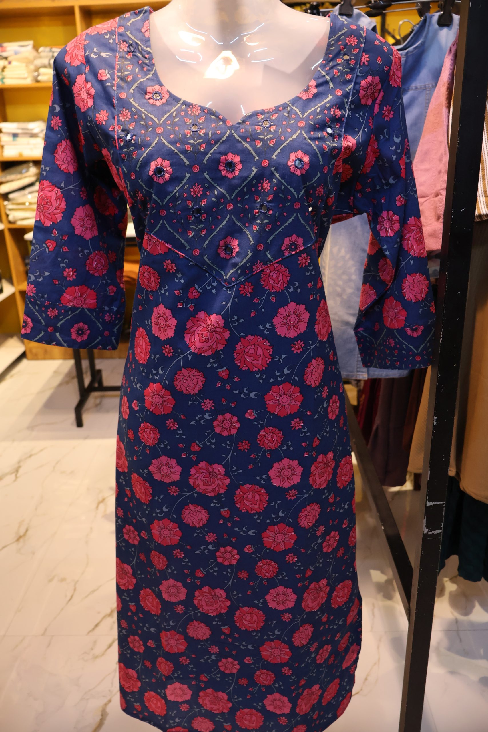 A beautifully designed floral kurta in a rich blue color with intricate pink flower patterns. A stylish and elegant piece for any occasion.